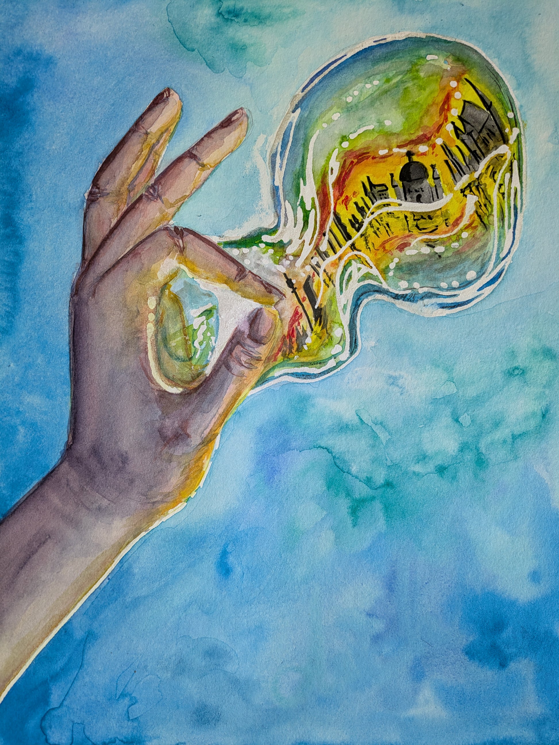 Seifenblase, Hand, Skyline Wien, bunt, ohne Rahmen